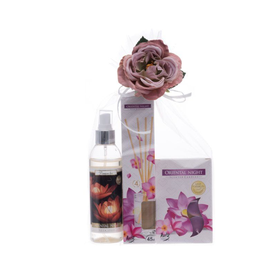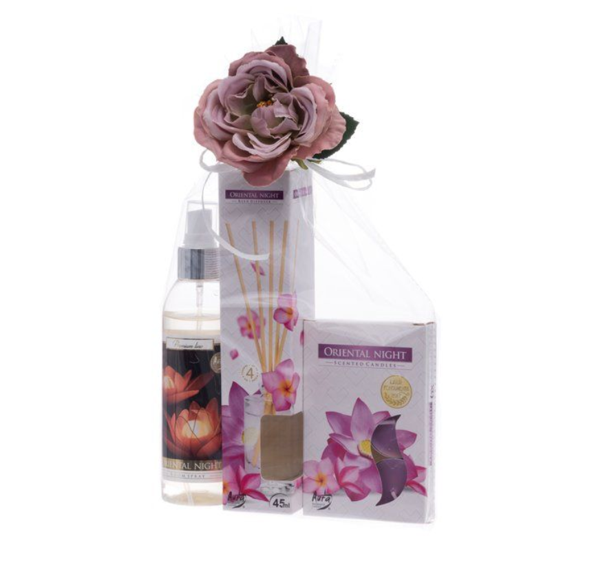 Rumduft 45 ml, rumduftspray 185 ml og duftvarmelys 6 stk. Der er 3 forskellige dufte i sortimentet.