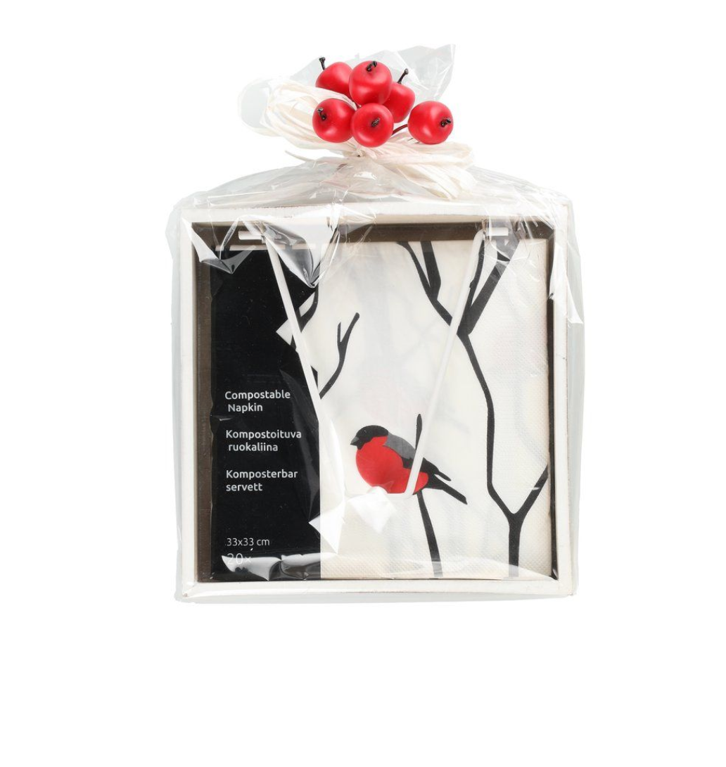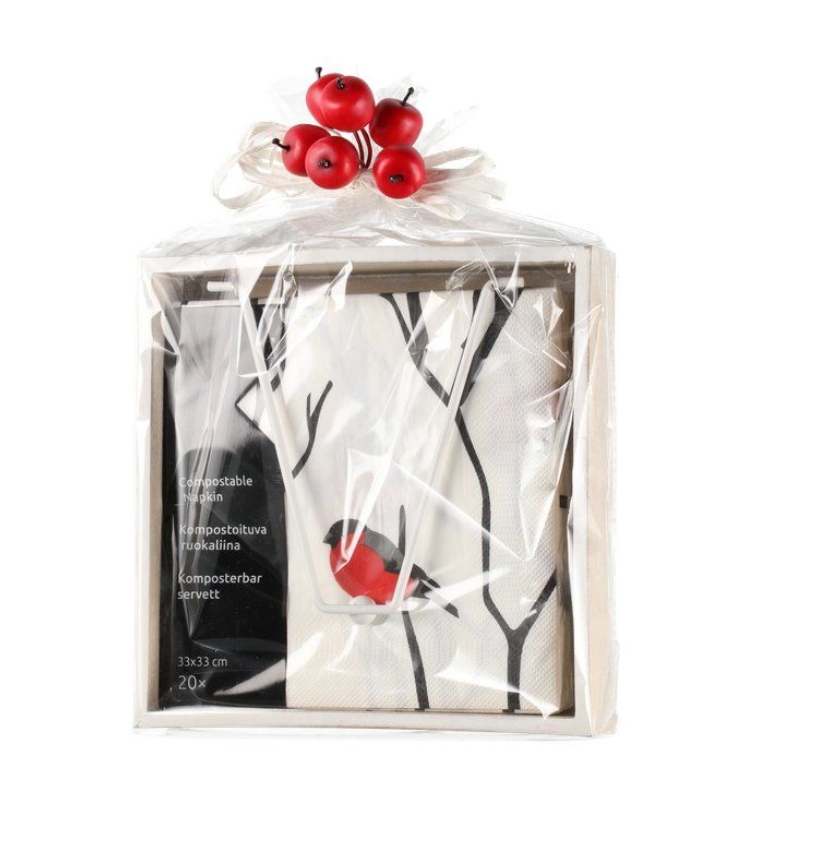 A beautiful and practical gift. Gift set includes napkin holder and bullfinch napkins 20 pcs 33 x 33 cm