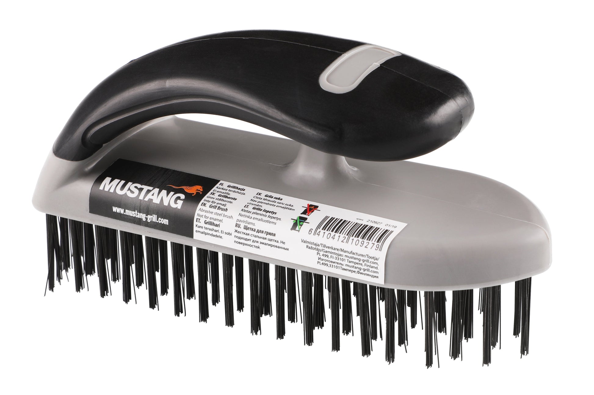 Ståltrådsbørste med hårde børster, sort gummibelægning på håndtaget for at give bedre greb.