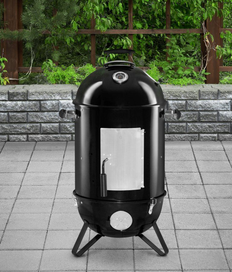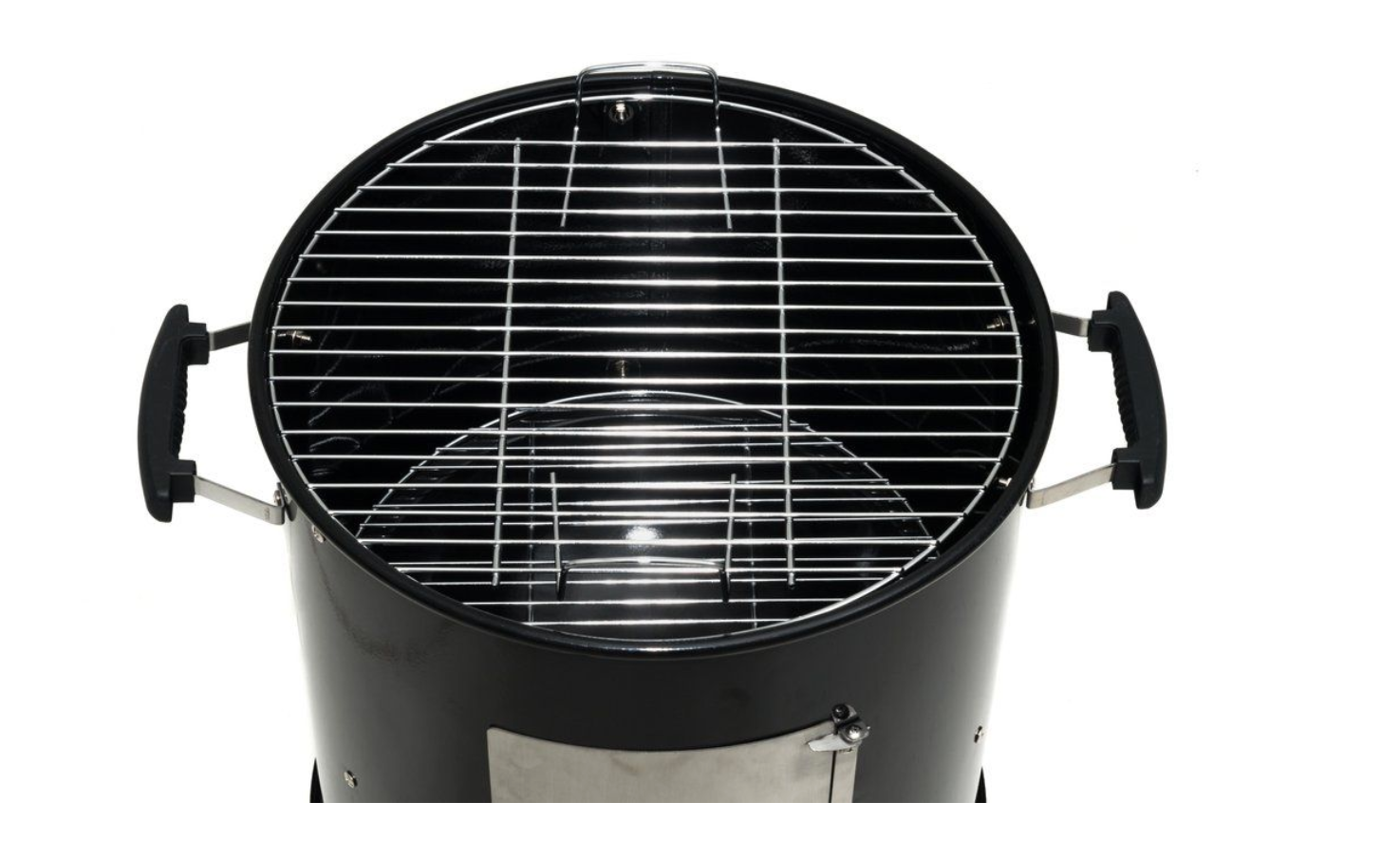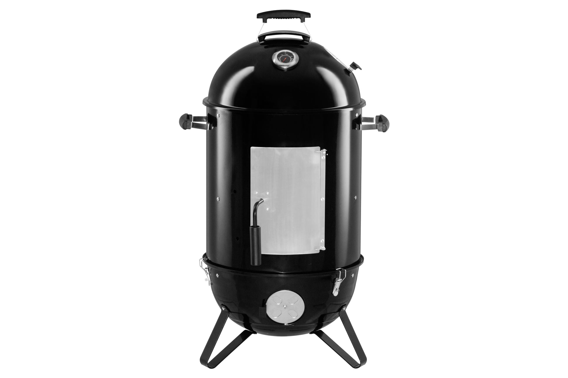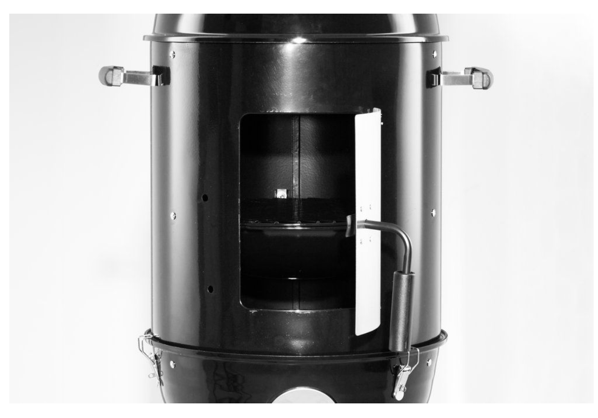 Ryger drevet af trækul eller briketter. To grill-/rygerriste af forkromet trådstål. Man har håndtag til at løfte er ude af ryger. Gitterdiameter 2 x 45 cm. Trådtykkelse 3 mm. Låg og bunddel er lavet af emaljeret stål. Mellemdelen er pulverlakeret stål. Rustfrit stållåg i midterdelen er til at tilføje kul/briketter eller rygeflis i trækulsgitteret. Også væske kan tilsættes i væskeskålen. Separat emaljeret askeskål i bunddelen, som har kulrist af emaljeret ståltråd. Askskålen har store lufthuller, hvorfra luften går ind i kul. Den nederste del har tre luftventiler. Låget har luftventil til justering af træk. Kroge i låget til ophængning af store fisk eller kød. Termometer i låg til kontrol af temperaturen inde i rygeren. Separat væskeskål til at holde fugt inde i rygeren. Tre stærke ben og løftehåndtag.