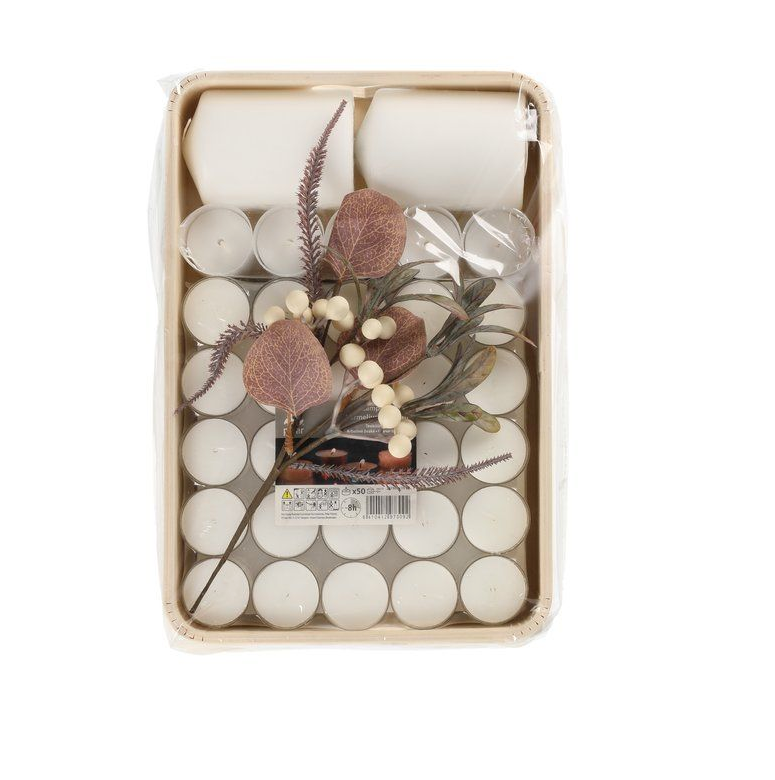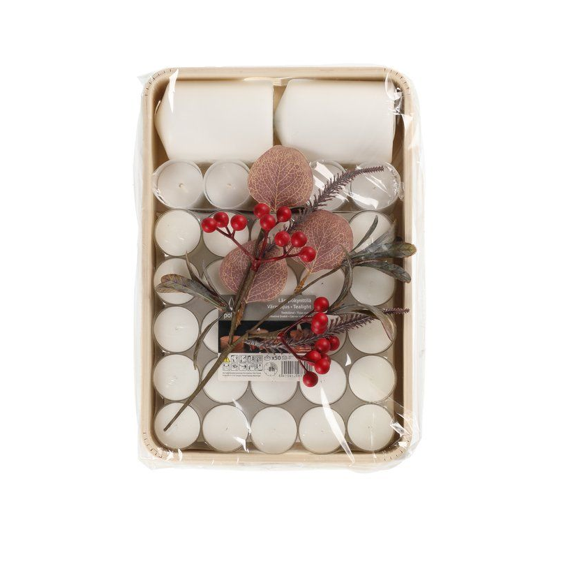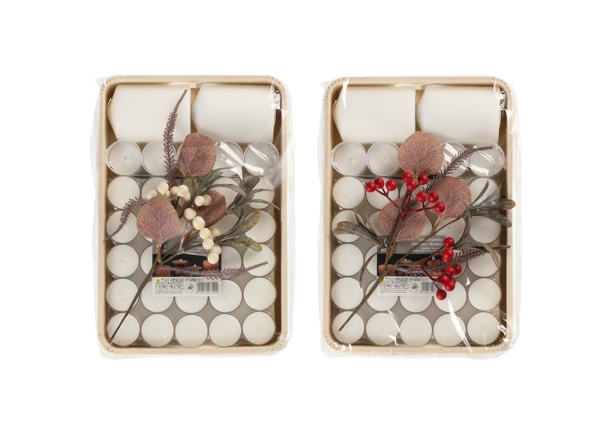 Pakken indeholder fyrfadslys 8h 50 stk, lanternelys 14h 5 stk, søjlelys 7x10 cm 2 stk og grenbær 30 cm (rød eller hvid).